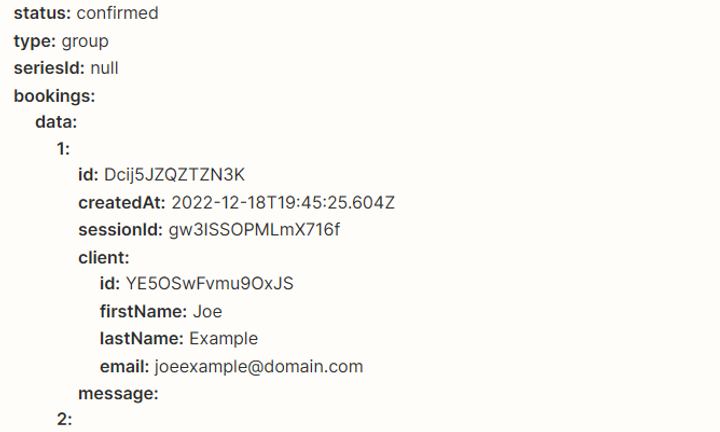 Below is an example of the trigger data for the "Session Scheduled" event that automatically includes the latest bookings information.