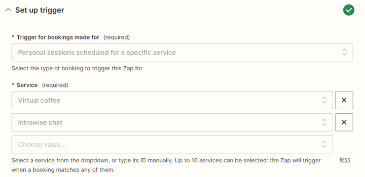 Zapier includes a powerful way to control when automation should run: Filters. With Filters you can add simple conditions on data that was received in the Trigger and tell Zapier whether the Zap should continue with this data. E.g. you can choose to only run this automation for certain services, or when a booking contains a specific word.